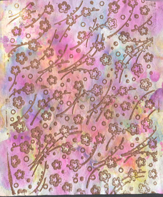 This is my favorite of the plum blossom sheets. It's a pity you can't see this in real life. I used the same colors as the first one; Kaleidacolor rainbow pad "Creole Spice" (only the yellow section), & Birthstone on a melt art mat with touches of Distress Broken China, misted with water, and swirled my paper through it. Dried it. Brayered Versafine Toffee on the positive side of the folder, ran it through the Cuttlebug, then thermal embossed with Artful Stamper Magnolia. The way the colors blended on this one and the gorgeous color of the magnolia is just fabulous. |