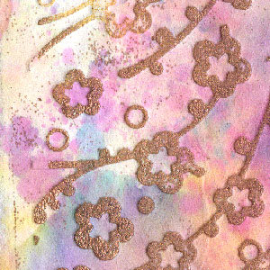 (Washi) I put some Kaleidacolor rainbow pad "Creole Spice" (only the yellow section), & Birthstone on a melt art mat with touches of Distress Broken China, misted with water, and swirled my paper through it. Dried it. Brayered Versafine Toffee on the negative side of the folder, ran it through the Cuttlebug, then thermal embossed it with Detail Copper. |