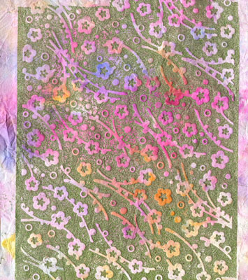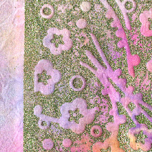 I put some Kaleidacolor rainbow pad Birthstone on a melt art mat with touches of Distress Broken China, misted with water, and swirled my paper through it. Dried it. Brayered Versafine Majestic Blue on the positive side of the folder, ran it through the Cuttlebug, then thermal embossed with clear. I found the pink in the Birthstone pad a bit too strong, which is why I added some yellow in the one above. |