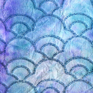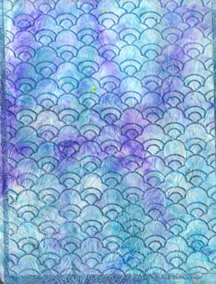 This is another one done on rice paper (washi). Kaleidacolor "Blue Breeze" and a touch of Distress Dusty Concord on a melt art mat, misted with water, and swirled my paper through it. Dried it. Brayered Versafine Majestic Blue on the positive side of the folder, ran it through the Cuttlebug, then thermal embossed with clear. |