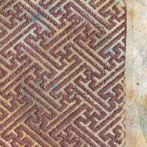 This is another one that looks better in real life. Also done on rice paper (washi) Kaleidacolor "Creole Spice" and some Distress Scattered Straw on a melt art mat, misted with water, and swirled my paper through it. Dried it. Brayered Versafine Toffee on the positive side of the folder, ran it through the Cuttlebug, then thermal embossed with Garnet. |
