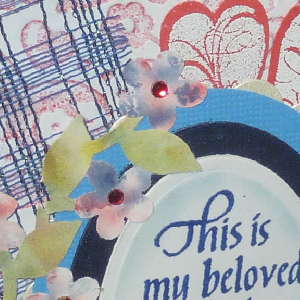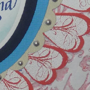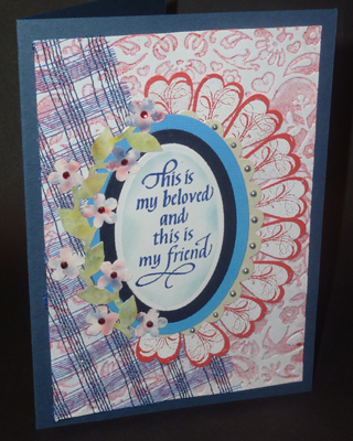 Score & fold the dark blue cardstock to make a 5"w x 7"h side folded card. Ink up embossing folder on the high points with Worn Lipstick, carefully place white cardstock down and close folder, run through embossing machine and clear emboss. Trim piece down to size to have about a 1/4" border all around card. Lay a piece of netting on the diagonal, wrap towards back and adhere in place with double sided tape. Layer on to card. Die cut 3 sequential ovals, smallest from white cardstock, then dark blue metallic, then medium toned blue Bazzil. Stamp the quote on the white one with blue stamp pad, clear emboss. Sponge some Broken china around the edges. Layer all 3 on top of each other, centering them. Die cut a scalloped oval to fit the previous largest die cut oval. Adhere to oval layers, off setting it so the scallops peek out more on the right. Stamp the smaller flourished heart with a pigment ink and emboss with Detail White 10 times on the backside of the red cardstock. Cut around each, leaving a small red border around stamping. Adhere to oval/scallop assembly, tucking the first and last heart deeper behind ovals, and spacing them evenly. Adhere this assembly to card. Punch out a 2 pattern piece of the flower trim in a pretty floral color, then do the same with a greenish tone. Cut the flowers off on the green piece. Adhere this piece to the floral colored punch out, matching all edges. Cut some of the petals away from the vine trim, so the sprig can be shaped to the contour of the ovals. Adhere to ovals. Final touch, add small red rhinestones to centers of flowers and small silvery/blue half pearls in the scallops. |