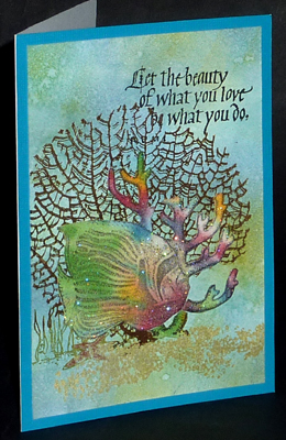 Note: this scene can be created with other stamps besides fish, like butterflies, birds or other types of fish etc. Just make sure the image that will be cut out from the tape is basically a line drawn image and is easy to cut. Put a piece of Sookwang tape on white cardstock, large enough to fit your rubber stamp. Remove release paper and sprinkle cool highlights and burnish with your finger really, really well. Using the pipette, pick up Ecoline colors and touch the tip of your waterbrush to the pipette, then onto the glittered surface. It will bleed a bit, pick up the next color and work beside the first, so they merge and blend together. Continue picking up and dropping colors onto your glittered surface. Add a touch of water to move or dilute slightly some areas. You can carefully use the pipette to apply color as well, but I found it puts a bit too much color if you're not careful. Dry thoroughly. Rubber stamp your image with the black, making sure you position your stamp in a pleasing area in relation to the colors. Then cut out your stamped image. Hint: I usually stamp on a piece of tracing paper so I can view the colors and where to position my stamp. Sponge Distress stamp pad colors all over your 5 x 7" white cardstock. Mist with water, let colors get activated (you'll see little water droplets emerging), then dry thoroughly. Rubber stamp the sand at the bottom with a pigment ink and emboss with Distress Antique Linen. Then rub with finger. Rubber stamp the flora on the left. Rubber stamp the large seafan and gold emboss. Adhere the cut out fish in a pleasing area. Rubber stamp the quote in the upper right hand side with the black. Score and fold your main card in half, to get a card when folded 5"w x 7"h. Layer the stamped piece onto the bright blue, then onto the main white card. Trim neatly. |