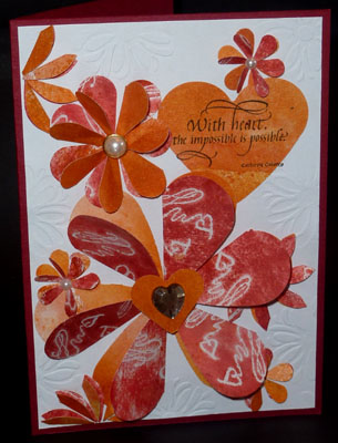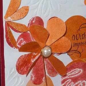 Stamp the flourish hearts on a piece of white cardstock with the Perfect Medium pad and clear emboss. Work direct to paper with the Distress pads, starting with Fired Brick, then with Worn Lipstick, mist with water and dry. On the reverse side, again direct to paper with Scattered Straw, Dried Marigold and some Mustard Seed, mist and dry. Place between some clean unprinted newsprint and iron off the clear embossing. Repeat till all embossing is removed. Punch out and or die cut various sized hearts. For the more bulbous hearts you will need about 5 or 6 per flower. For the long and skinny type hearts you will need about 8. Fold each heart in half. Make enough folded heart petals for one flower with the embossed hearts facing out and some flowers with the orange color facing out for added variety. All these petals were done with 1 piece of 8.5 x 11' cardstock with some left over. Trim down a white piece of cardstock to leave a small border on your 5 x 7" card. You can dry emboss the white background with your embossing folder now, or selectively emboss areas after the flowers are assembled using a hard rubber mallet on the edge of a table supported by a leg - this is the method I used. |