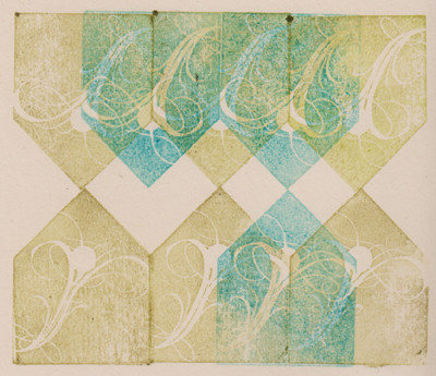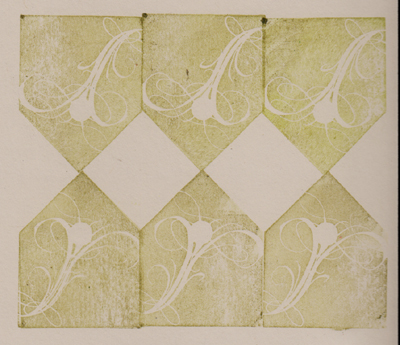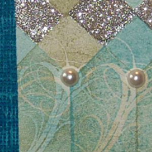 Repeatedly stamp the flourish house as shown in figure "Background #1" using the Versamagic "Hint o Pesto" pad on cream cardstock, to create a finished background approx 4"w x 6"h. Note: Use a stamp positioner if needed. I trim my rubber right up to the design and then I eyeball where to stamp it. A little deviation here and there, makes it your own... Repeat stamping as shown in figure "Background #2", using the Distress Broken China pad, first stamping on a scrap piece of paper to remove excess ink, then stamping on background piece, also shift the stamp design over, so it overlaps two previous houses. You can now start to see the little open squares to fill with cut pieces of Sookwang tape and then glittered. Burnish well. Touch up any mismatch tape areas with the Quickie Glue pen and more glitter. Trim down background, keeping the design balanced and to fit card as shown. |