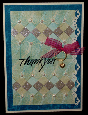 Score, fold and trim the cream cardstock to make a 5"w x 7" h side folded card. Cut a piece of Core'dinations cardstock a little smaller than card front. Sand edges and adhere to card front. Make background - see below. Die cut a border with a Spellbinders die in cream, emboss and sponge Broken China. Trim down as shown and adhere to back of background piece. Adhere to card front. Stamp the "Thank You with the Black stamp pad and clear emboss. Attach a gold split ring to the heart charm, string onto the clipola, tie a bow and string the clipola through the knot on the back. adhere to card front with some glue, allow to set completely before standing up. Add half pearls in each little circle of the flourishes. |