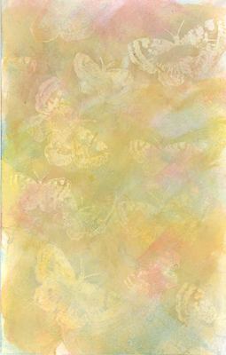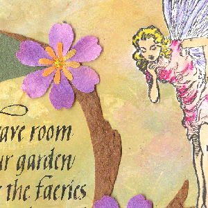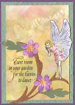 Created: June 5, 2009 For the background I used Quietfire Design butterflies both the large and small and the Ranger's Resist stamp pad on glossy paper (see technique detail below). Rubber stamped my quote "Leave room in your garden" also from Quietfire, using a Versafine black stamp pad. Mounted this to a thick green mulberry paper then onto a purple toned cardstock. Rubber stamped the faerie (Evolving Images #1955) on white cardstock, colored it in with Copic Markers and Tombows and added glitter on the wings, then cut it out. The flower branch is a Sizzix Bigz die Decorative Leaves & Flowers #655367. Used thick mulberry paper in a brown and a gold flecked green. Adhered them to my page then adhered the faerie. Used 2 small punches for the purple flowers, an elongated heart shape and an 8 petal floret. Punched them out of marbled rice paper I made ages ago (oriental paper works beautifully as well). Assembled and glued them together, then added some yellow stickles. |