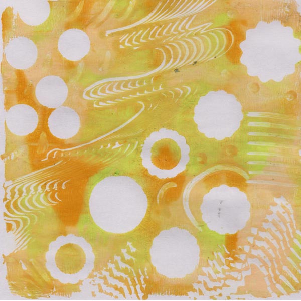 Sample 9: Brayer Gelli plate with a few fluid acrylic colors. Place various punched or die cut elements all over, add some combing or other texture making effects. Pull a print. Colors used for sample 9: Ceramcoat Lima, Empire Gold & Palace Flesh