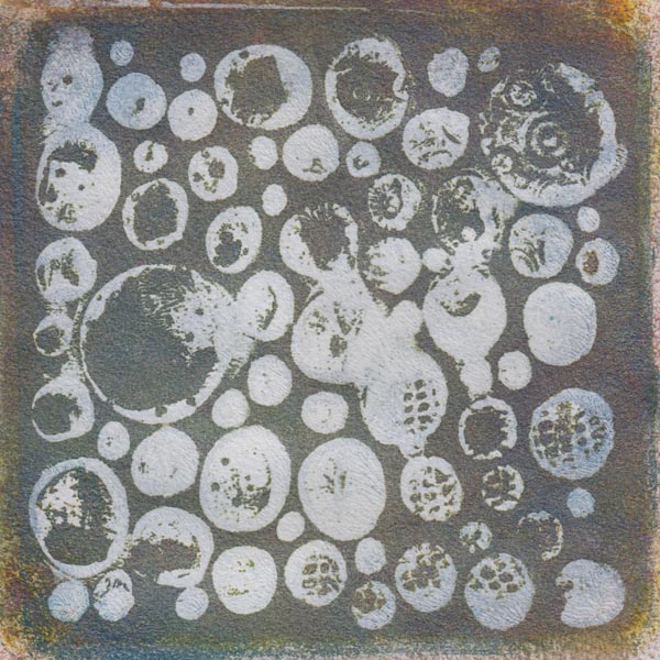 Sample 18: on Arches Text Wove Place stencil (needs to have nice size openings in the design) on Gelli plate and using a catylst applicator or plastic palette knife, smear on Golden’s soft gel medium. Impress various textures in the openings. Remove stencil and pull a print (you won’t see anything now). Allow to dry.