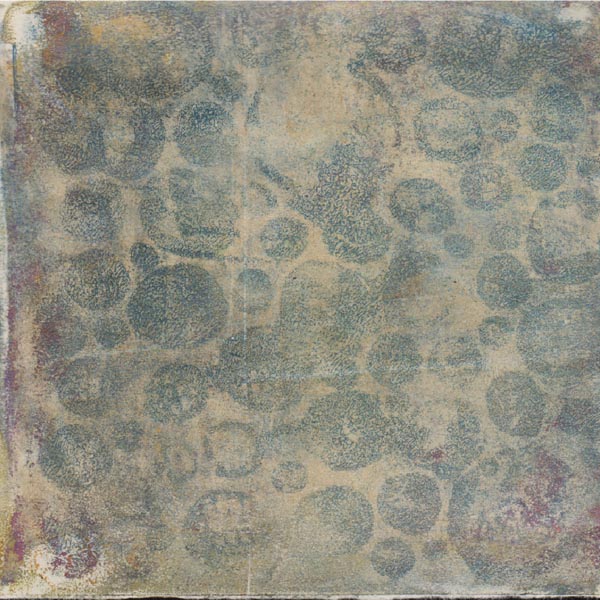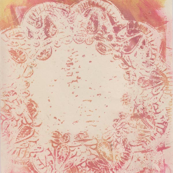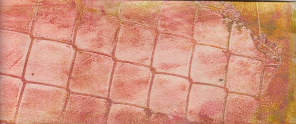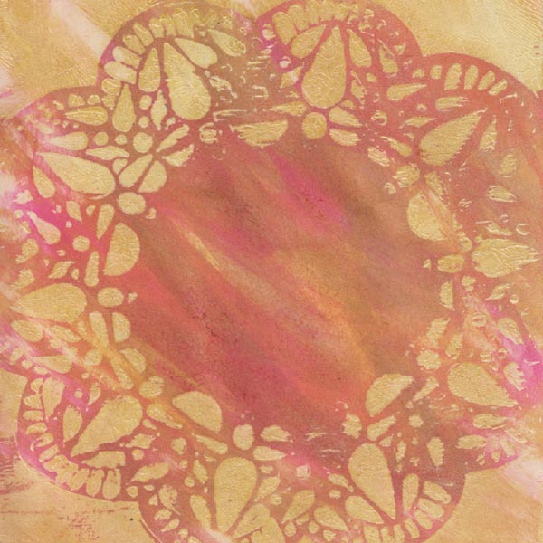 Sample 19: The impression made on the Gelli plate from the gel medium design will make a nice print too. Just pull a print. Brayer on Gelli plate Silks Acrylic Glaze “Emperor’s Gold” and pull the print again.