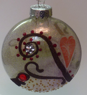 On a separate piece of glitter tape, sprinkle with white, burnish well and clean off any excess glitter using a damp soft cloth. Ink up your heart with red stamp pad ink and stamp onto glitter. Clear emboss. Cut around heart leaving a nice white border. Carefully remove the release from the tip of the heart and start applying to ornament, then continue removing release paper and pressing down. Use the Glue pen and squeeze generous round dots along the flourish lines, sprinkle with glitter. One I did with the red, one with the orange and I did a bunch of small dots on the bottom of the ornament and sprinkled with gold. I added a pink toned red, & clear floral rhinestone.