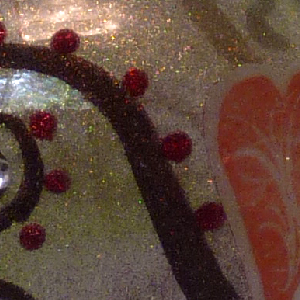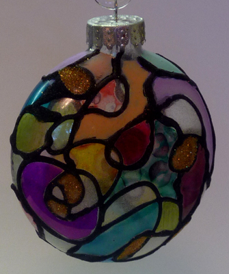 Glitter: Black, Warm Highlights, Dark Gold, Chartreuse I dribbled the Plexi glue in a random loop design. Sprinkled Black Glitter all over, shook most of it off and allowed the glue to dry overnight, then brushed the balance of glitter away. Repeated with other side. Then had fun using all kinds of coloring agents to fill in the spaces. I wanted something more opaque on top to hide the prongs so I used Sakura Soufflé pens. The purple on the upper left and marine blue on the right are Bic Alcohol markers (I tried Copic markers and they didn't work very well - no color). All those splotchy sections are alcohol inks dribbled into each other. I also painted some plain alcohol ink sections around the bottom. Small loops have various colored glitter. I had a couple spaces open and thought I'd try Lumieres. They work, but need a couple coats to even out the streaks. I used Sakura Glaze pens that worked really nice. The Sakura Metallic pens did not work - they never dried, so removed them. When all done, the glass was too transparent so I sprayed some glue to the inside and sprinkled with Warm Highlights. |