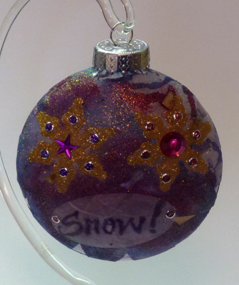 Stamp the word Snow on a piece of tape sprinkled with White, using a purple stamp pad and clear embossing. I cut it with the oval shape from the Fancy Tags die set. Apply to ornament and add some red Glitter dots. Add glitter dots to star points and various rhinestones.