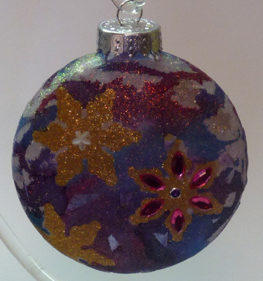Created: September 27, 2010 I purchased the clear flat type of Xmas Ornaments from a major crafting store, then went to town with the glitter. There are 4 ornaments and for each ornament I'll mention the individual glitter colors I used.