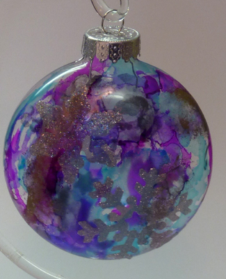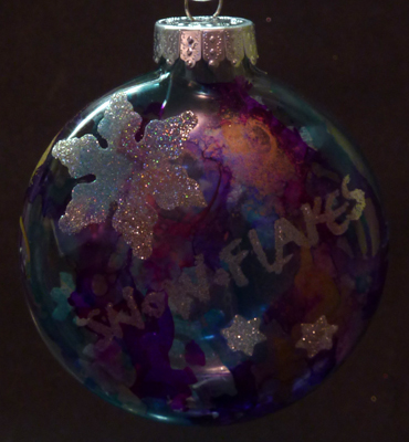 Glitter: Cool Highlights, Stardust I dispensed the alcohol inks straight from the bottle to the outside of the ornament - a very little at a time and rotated the ornament to move it where I wanted it. Die cut some snowflake shapes using the 2 medium sized dies from the tape sheet or tape with release paper on both sides. Apply to ornament, Remove top release paper and sprinkle some with Cool Highlights & others with Stardust. Note: one is more transparent than the other. Mask your Snowflake word stamp, inking only the word Snowflake with the Glue pad, press down on the ornament and then lift. Note: Make sure ink pad is juicy and do not put stamp on acrylic block it will be too difficult to follow the contour of your ornament. Sprinkle with the Stardust. |