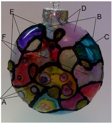 A - Alcohol inks B - Bic Alcohol Markers C - Lumiere Paints (Citrine) D - Sakura Soufflé pens E - Glitter F - Warm Highlights on inside through clear glass |