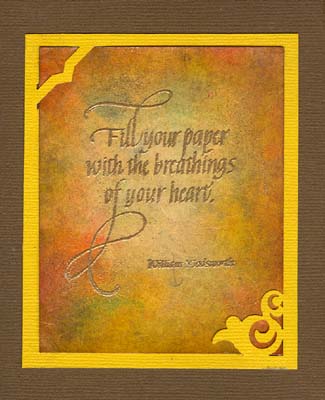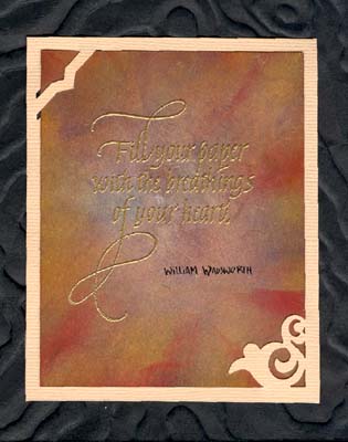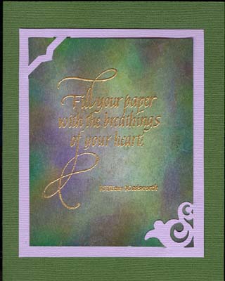 Each background starts out with a piece of white cardstock which I was using as a mask for a border background on pages on one of my journals. The repeated coloring and spraying and overlaying created this fabulous darker edged glowing central backgrounds. I was swiping the colors from about an inch on the mask and over towards my border on the pages, using about 3 colors per border. Each border had different colors, so colors were really merging. After each border was colored, I used a makeup pad to wipe excess color away and of course wiped the color from my mask. When I had done about 10 borders, I started spray "fixing" my pages using this mask as a mask for spraying as well. I used 3 masks, because the build up of the spray took a while to dry. Then I would go back to it when it was dry. I would say I did this about 3 times on each of these masks. My color palette was: Hansa Yellow, Yellow Ochre, Orange, Permanent Red, Turquoise, Ultramarine Blue, Phthalo Green, Violet, Bright Yellow Green Shade & Burnt Sienna. I punched out the 2 corners (Marvy & a Corner Adorner) to slip my background into from a piece Bazzill monochromatic cardstock. I rubber stamped the quote (Quietfire Design) with gold pigment stamp pad and Queen's Gold embossing powder. |