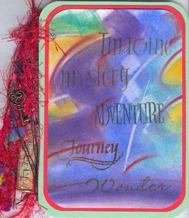Created: June 22, 2008 This is the third card using the same technique as the "Imagine Card". Love this background. The other card "Explore" is from the same piece of cardstock background. I used a a white 65# cardstock and swiped colors randomly and abstractly over the surface using the Pan Pastel sponges (Hansa Yellow, Yellow Ochre, Violet, Turquoise, Phthalo Green and Streaks of Permanent Red). I then used the square edge of an eraser to make my little box shapes and the lines. I tilted the cardstock up side down and using a very soft brush to flick the eraser bits away. I rubber stamped the words with Adirondack Rainbow Dye stamp pad. Then used Krylon Workable Fixative to set my pastels. Rounded the corners on all cardstocks using a Corner Adorner punch. Mounted it to a piece of bright red cardstock then onto a pale green cardstock. Added a bunch of fibers and a couple charms (Key charm and Birthday charm) Stamps used: Imagine & Mystery (Roann Mathias available through The Stamping Studio), Wonder (Just Jhones Attic Treasures set), Adventure (Heidi Grace Cherry Wood Ln set), and Journey Quietfire Design) Note I sprayed with Krylon workable fixative. |