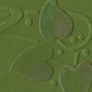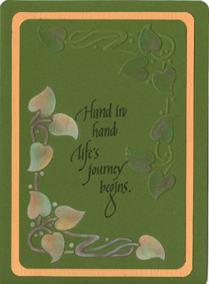 You can approach this card in two ways. First rubber stamp your quote and then do your stencilling/embossing around it; or you can do the stencilling/embossing and use a stamp positioner to place your rubber stamp quote. I took the 2nd route. It's a little more difficult, especially if you want a certain quote on your card and you didn't leave enough room - BIG GRIN. In my case I was open to any quote that would fit in the area. The upper right hand corner was dry embossed first. I rubbed some waxed paper over the back where I was going to emboss so that my medium sized stylus would glide rather than get caught up in the fibers of my card. I taped my brass stencil down and taped one side of my card down where I wanted the dry embossing to be. This is a dense olive toned cardstock, so a light box or window would not work to see where you need to emboss. I then carefully lifted my card edge (without shifting it out of place) to see where to place my stylus, and then just let my tool find the edges of that pattern. I would keep lifting and placing my tool for each little pattern section, until the embossing was finished. I then went over some of the detail areas with a slightly smaller stylus getting into the points of the leaves. |