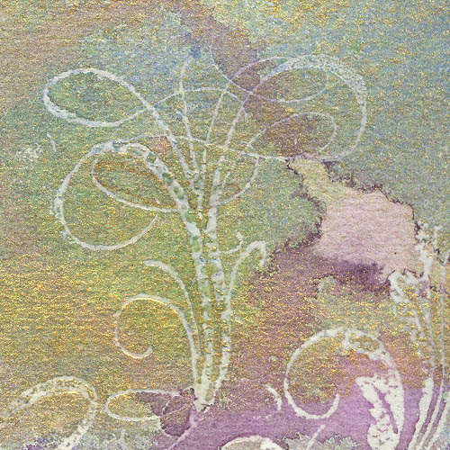 I used several brands of Flourish rubber stamps including two from the Quietfire Design set. Arches Text Wove paper (cardstock or watercolor paper can also be used) Clear pigment stamp pad (or Perfect Medium etc) Clear embossing powder Watercolor, inks, dyes etc. I used Magic Color acrylic colours diluted with water - Delta Violet, Mars Red, Chiffon Green & Cobalt Blue Mini Misters Mister with only water Perfect Pearls - Perfect Gold Dilute the Magic colors in mini mister. Two eyedroppers full of 1 color into the mister, then fill to 3/4 full with water. Do this with all four colors. Rubber stamp your paper using the clear stamp pad and then thermal emboss with the clear embossing powder. Mist paper with some water than with the color misters, randomly spraying all over. It's also great if you get blots of color in some areas. I misted with more water till it became slightly puddled so the colors would move when tilted and create streaks and runs etc., When I was happy with the look, I used a hair dryer to speed up drying time. This also moved some of the colors around creating nice hard edges. When the paper was just about dried I mixed up my Perfect Gold, about a good 1/4t to 1/2t with about 4 t of water in a little cup mixed well) and painted the whole paper with it using a foam brush. Going over a section only once, not back and forth. If you miss a few spots, that's ok. Dried again with a hair dryer. I then lay a few pieces of newsprint (not a printed newspaper) over the embossed designs and ironed (on high with a dry setting) to remove the clear embossing. Continued this until all was removed.