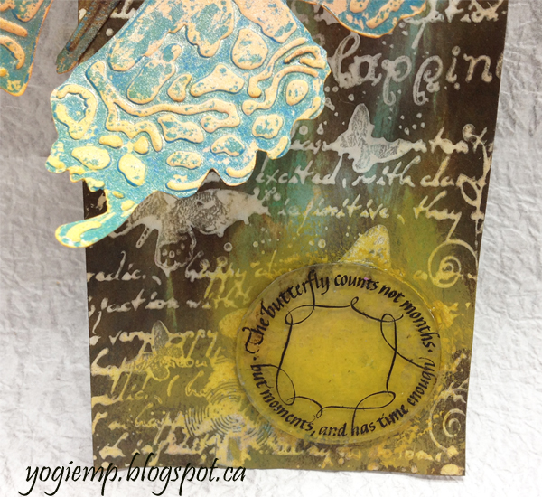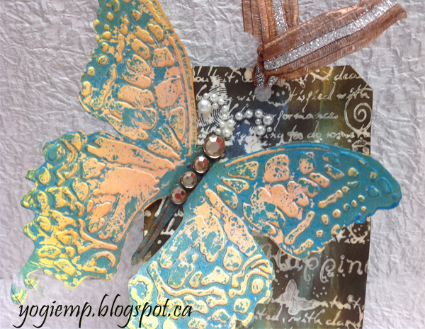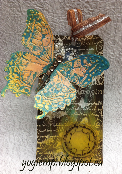 Die cut the tag from white cardstock. Inked up my background stamps (Local King Rubber "Happiness") using Distress Picket Fence acrylic dauber as a resist. Dried thoroughly. Applied stains in various colors ("Broken China", "Mustard Seed", "Faded Jeans", "Ground Espresso"), misting with water, drying. With a damp paper towel, wipe the excess of the resisted areas. Sponged around the edges with "Ground Espresso". Die cut the butterfly (Tim's Sizzix Bigs "Layered Butterfly" with embossing folder) from white cardstock. Embossed the design, first applying "Broken China" acrylic paint to the embossing folder, embossing (cleaning my folder immediately...) drying the butterfly. |