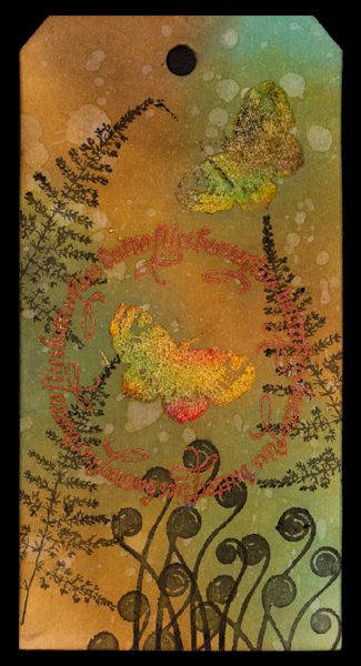 Nostalgic Batik: I stamped the round butterfly circle (Quietfire Design) with Versafine Crimson Red. Stamped the butterflies (also Quietfire) with my custom pad from the other day and clear embossed. Sponged Distress pads, Broken China, Shabby Shutters, Tea Dye, Walnut Stain & Dried Marigold. Cleaned off the excess colors from the embossed images. Stamped the black details (Quietfire Design "Fiddleheads"; Time to Stamp "Flowers & Leaves" stamp set) with Distress Black Soot (needs to be water based stamp pad), and wiped off what fell on the embossing. Ironed the embossing off between some newsprint. Dropped some water droplets and dried. |