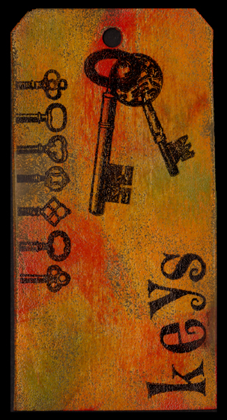 Rusted Enamel: Love this technique. Remember doing it on the 12 tags of Xmas. Direct to paper with Distress pads Shabby Shutters, Mustard Seed, Wild Honey, Spiced Marmalade & Barn Door. Put clear embossing powder all over and then vigorously taped the back of manila tag to remove some of the powder to give a distressed effect when heat set. Sponged Distress browns (Tea Dye, Walnut Stain) and some Black Soot, heavily to get into the crevices of the non embossed areas. Wiped off the embossed areas. Stamped the keys (Stubby Stampers "Key Top Border"; Scrollworks "Large Key" & "Asian Key") with archival black.