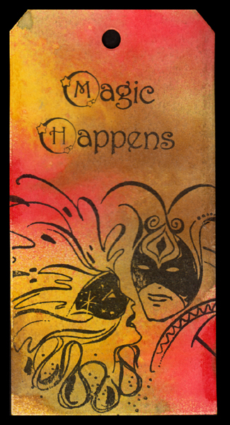 Perfect Distress Mist: You're not able to see the sparkle from the Perfect Pearls on this tag, but it's definitely there... So mix a mini misters with your dropper full of Distress Re-inker and then a nice amount of Perfect Pearls, 3/4 full of water, shake up (put a medium sized pearl bead in to mix). I used Barn Door with Perfect Gold; Vintage Photo with Perfect Bronze; and Mustard Seed with Kiwi. Dried, then stamped my images (Another Stamp Co "Masquerade Couple"; Faerie Song "Magic") with Archival Black. |