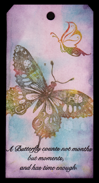 Perfect Distress: The first tag I made did not turn out very nicely and was done on a manila tag. So started a new one on 110# white cardstock. Used Distress Stains Milled Lavender & Broken China, misted heavily with water (bkgr'd needs to be very light colored) and dried (very important step). Stamped my large butterfly (Penny Black "Soft Wings") using my custom pad from a few days ago, and just moving the stamp all over the pad as needed. Used Heirloom Gold Perfect Pearls, pounced pearls into image and dusted off excess. Dried and then misted the image to let the colors from the butterfly wick out. Immediately dry again or there will be too much wicking... Stamped the small butterfly (Flourishes) with the same custom pad. Stamped the quote (Flourishes) with Archival black. Sponged Distress Dusty Concord around the edges.