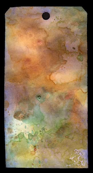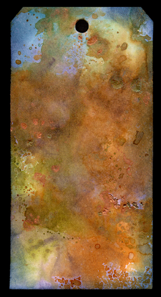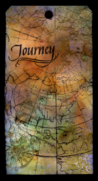Perfect Splatter Distress: The first tag with this technique is below. Loved the background, but didn't care too much for it after stamping my image... Hence this one. BIG GRIN For both tags I used Vintage Photo, Broken China, Forest Moss & Rusty Hinge; Perfect Pearls Kiwi & Perfect Bronze. For this one stamped the map bkgr'd (Flourishes) and the word Journey (Quietfire Design) with Archival Black. The map image was stamped twice giving it a fussy look letting the word journey really stand out. Edges sponged with Chipped Sapphire. |