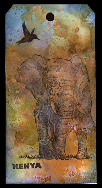 Perfect Splatter Distress: con't... For this one stamped the elephant and word (Local King Rubber) with the Archival Black. Stamped the little bird (Kaiser Craft "Hummingbird") also with the black. Edges sponged with the Chipped Sapphire. Hit the elephant with the side of a white colored pencil