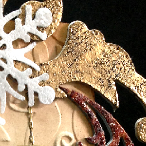 Cracked Glass technique: apply Glue & Seal on glass or plastic. I didn't have any so experimented with Golden's products and found Polymer Medium (Brilliant) worked well for the adhering layer. My ornaments were cut from .007 Graffix plastic on my electronic cutter. I hand cut the little gold tops from Peel Off material and added the little gold chains. When dry put on a normal thickish coat of Clear Rock Crackle. Let that dry. Applied Alcohol Ink "Sailboat Blue" and then added Mixative "Silver on the one on the right sponging with some blending solution, "Gold" on the left one and both silver & gold on the middle one. I really liked the look on the smooth side, so turned the crackle to the inside. Tarnished Metal: On a black surface (I used chipboard die cuts painted with black soot), apply Distress Emboss and emboss with gold or silver or whatever color metal you want. Ink surface again with the emboss and sprinkle here and there with clear UTEE, heat with Tim's heat gun. When cool, run paint dauber lightly over surface. Tinsel: I didn't have Tim's tinsel so the heat stage didn't work the same way. Mine shrunk in length instead of the fibers curling. I tried another brand of tinsel from Michael's which worked. But the coloring worked. I used black tinsel instead of silver, coloring with Gold Alcohol Mixative and a felt too. Attached to card with Tim's Tiny attacher. The snowflake was cut with my electronic cutter from Sookwang tape adhered to cardstock, then glitter added. The flourish is from Day 3 Rock Candy Glitter. Colored Grungeboard flourish with Distress, applied Glossy Accents and sprinkled with clear Rock Candy. |
