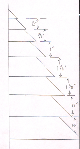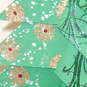 To begin, cut a bunch of squares - 2 of each size - from 1.5" to 8.5" in increments of 1". Each side of the tree has 8 squares. Fold all of the squares as directions for Tea Bag Basic Triangle shape. Cut a couple pieces of tracing paper or other scrap paper to use as a mask for stamping the flourishes. Place masks under the flaps, stamp the flourishes with Versafine Olympian Green, and clear emboss. Work one tea bag triangle at a time. When flourishes have all been stamped, stamp the snowflakes with Versafine Toffee and emboss with Queens Gold. Assemble the tree. Put a dab of glue on the inside of the 2nd largest tea bag triangle. Place the largest triangle inside the opening and align the straight edges along the guidelines of a self healing cutting mat with a separating distance of about 1.5". Put a dab of glue on the 3rd largest tea bag triangle, place the 2nd tea bag triangle in the opening and align as above with a separating distance of about 1.25". The next two triangles will have a separating distance of about 1-1/8". the next 3 will have separating distances of approx 1", 3/4" & 1/2" respectively. (see spacing diagram HERE). Fold in bottom triangle legs s they don't interfere in the standing position. |