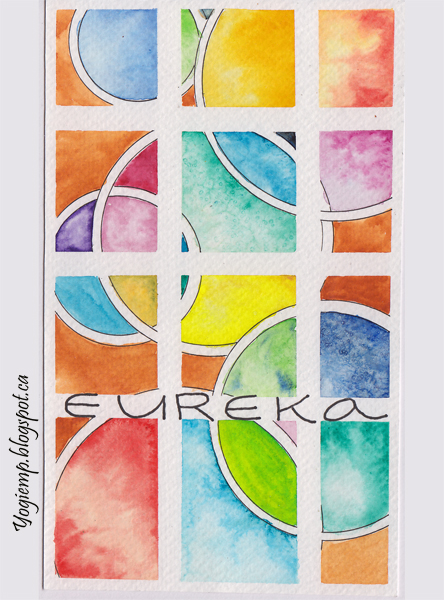 Created: March 7, 2024 size: 4.5"w x 7.5"h I've been meaning to play with creating circular art with jars and toilet rolls etc... Finally did!! On Fabriano 140# w/c paper taped my lines with Washi tape, drew the circles with a circle template and painted with various brands of w/c. Wrote the word "Eureka" with a Pentel Mattehop pen.