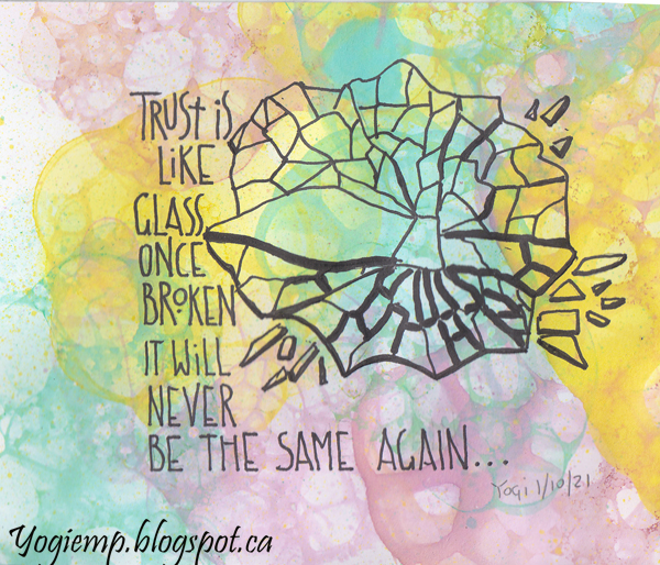 Created: Sept 21, 2021 I decided to try the watercoloring challenges on Doodlewash... I will make it into a card eventually. On Staples 110# cardstock did a bubble background with dish soap and watercolors, using a straw to create the bubbles and then pressed my cardstock into the bubbles... Did this eons ago and resurrected it. Then Doodlewash asked for glass and I thought it would give the extra texture of broken glass... With a black Zig writer drew my design and the lettered the quote in Monoline style. Words: Trust is like glass once broken it will never be the same again.