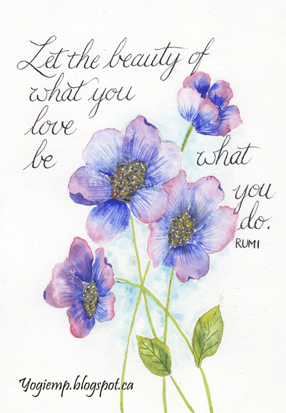 Created: July 15, 2022 I saw this floral design by Penny Black and had to create it... On Strathmore Ready Cut watercolor paper 140# painted the flowers with Winsor/Newton & Holbien watercolors. Added the quote using Sumi ink and pointed pen in Copperplate style.