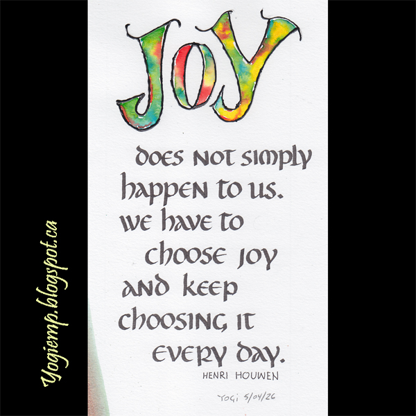 3D Liner - Joy - Choose Joy Created: April 5, 2026 Modified: size: 4.5"w x 7.5"h On Canson Mixed Media paper lined the JOY letters using a new product to me... Stamperi Contour Black - needle nose tube. When dry adhered my paper to heavy cardstock so it wouldn't warp. Loaded the letters with water and dropped in Kuretake w/c #30 Cad Red, #43 Cad Yellow, #51 Light Green & #62 Turquoise Blue. Wrote out the rest of the text with a Staedtler Calligraph Black 2.0 broad edge tip. words: Joy does not simply happen to us. We have to choose joy and keep choosing it every day. Henri Houwen |