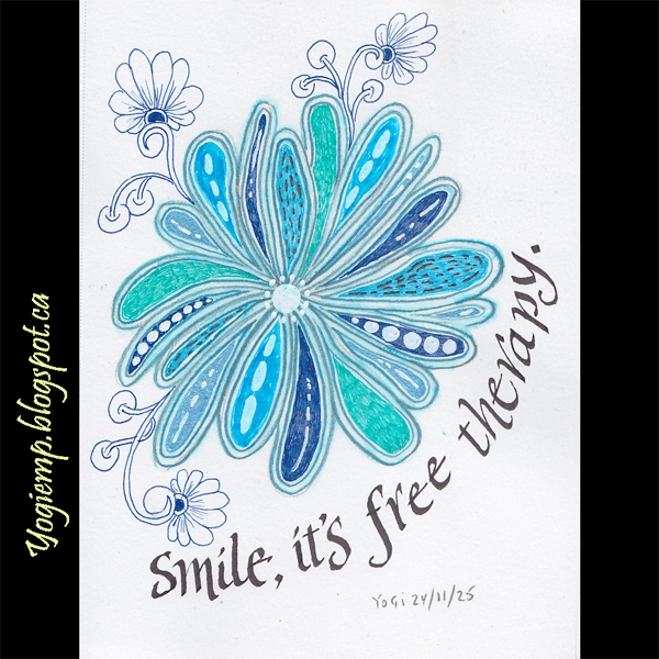 size: 6"h x 4.5"w On Canson Mixed Media paper created the floral design using various colors and brands of gel pens, adding the doodle flowers with a blue Juice Up pen. Words done with a Staedtler 3002 pen size 2.0 words: Smile, it's free therapy