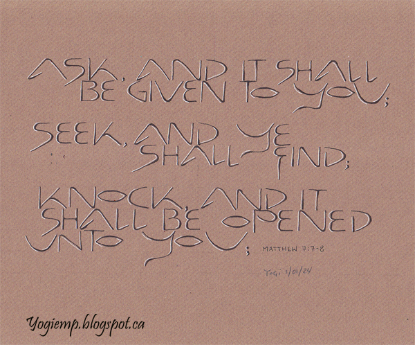 1, 2024 size: 10"w x 8.5"h I was reading an Amish love story and came across this Bible verse and it just resonated with me... and this lettering style landed in my Pinterest feed which I really liked (sorry no name given). On Canson Mi-Teintes paper , using a medium Brush Calligraphy pen, then highlighted with a white Juice Up pen. Words: Ask, and it shall be given to you; Seek, and ye shall find; Knock. and it shall be opened unto you; Matthew 7:7-8