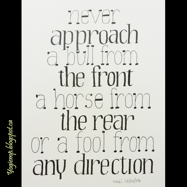 26, 2026 size: 5.5"w x 7"h My Guild's next challenge is "Cowboy Wisdom". I though this was a good lesson... On Canson Mixed Media paper wrote out the text in a light and heavy funky serif style using both a Juice Up pen and a ZIG Calligraphy Marker words: Never approach a bull from the front, a horse from the rear or a fool from any direction. |