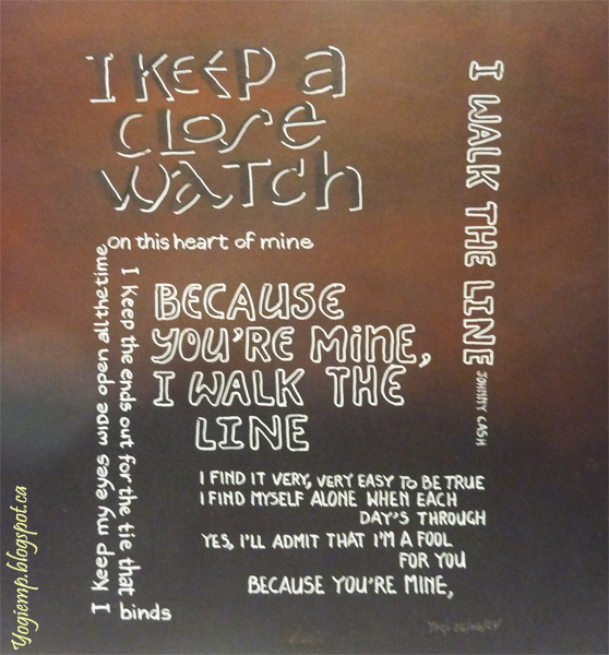 2024 Our Galleria topic for Sept 2024 is Lyrics (we had that topic 2 years ago so I can't use the same lyrics... which were "He Wore Black Denim Trousers"). This one was done by Johnny Cash. On 12 x 12 scrapbook cardstock I applied Pan Pastels to the upper half of the cardstock (red, violet and gold/copper with a dry baby wipe). Used an eraser to create my letters. Added a white Gelly Roll gel pen highlight to each letter. Created the rest of the text with the gel pen in various funky styles going this way and that... words: I keep a