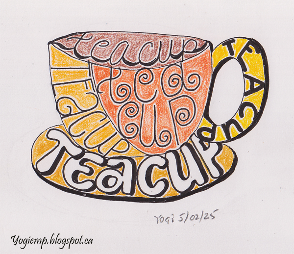 5, 2025 size: 4.25"sq Our Galleria topic for March 2025 is 1 word written 5 ways. I've done this before for a Scribbled Lives prompt. Then I did one called Whirlpool recently... now Teacup On misc cardstock created my decorated teacup using Juice Up pen and Zig Writer, colored with Prsma Colored pencils in "tea" colors... Don't drink mine with milk - ugh!! words: