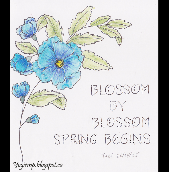 Blue Floral - Spring Begins Created: April 27, 2025 size: 4.5"w x 6"h I was at our Guild's play day this past Saturday and created a bunch of things... this was the 1st piece - I love drawing flowers... On Canson Mixed Media paper drew out the floral design with a Zig Writer and colored with Prisma colored pencils. Used a dot alphabet style for the lettering. words: Blossom by blossom spring begins