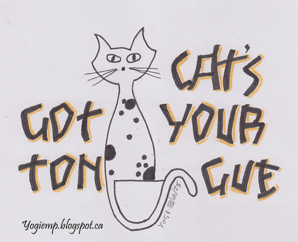 2025 size: 6"w x 5"h On Edge Mixed Media paper using a Zig Writer & Itoya Double Header Calligraphy pen and shadowed with yellow marker. words: Cat's