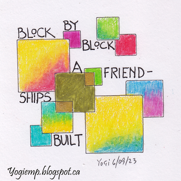 2023 Drew out my squares with a Juice Up pen on Fabriano 1264 Mixed Media paper. Colored with Prisma colored pencils and blended with a Lyra Splender Blender. Added the text with a Pilot Signo Gel Pen words: Block By Block A Friendships Built