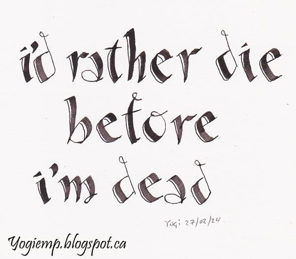 27, 2024 size: 5.5"sq I'm loving these sayings that I found in a Beth Wiseman book. There were 3 on the same page... On Canson Mixed Media paper wrote out the quote using a 2.4 Parallel pen dipped in Sumi ink. Added the thin line with a black Juice Up pen |