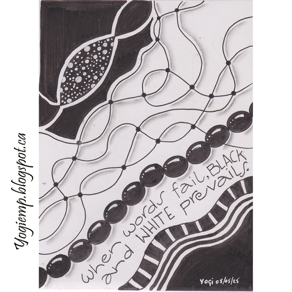 2025 size: 4.25"w x 6"h Just doodling again... I was in a black and white mood. On Canson Pen & Ink paper using both a Zig Writer and a Juice Up pen as well as a Caran d'Ache B pencil and paper stump. words: