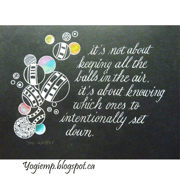 size: 7.5"w x 5.5"h On Canson Black Drawing Paper drew out the circles and colored with Prisma Colored pencils and doodling with a white gelly roll pen.. Text with W/N Calligraphy Ink. words: It's not about keeping all the balls in the air. It's about knowing which ones to intentionally set down.
