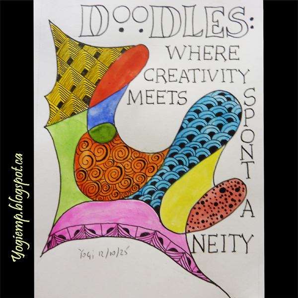 size: 6"h x 4.25"w On Canson Pen And Ink paper drew out the abstract doodle design and painted with w/c. Text with a ZIG Writer. words: Doodles: where creativity meets spontaneity.