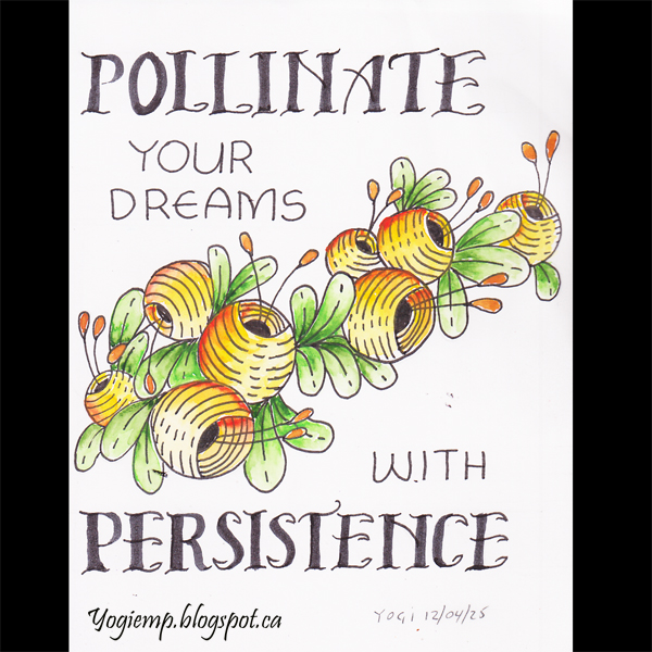 Doodling - Pollinate Your Dreams Created: April 13, 2025 size: 4.5" w x 6" h I was playing with this tangle design and they reminded me of bee hives... Done on Canson Pen & Ink paper using a Zig Writer. Then added the text and colored with watercolors. words: